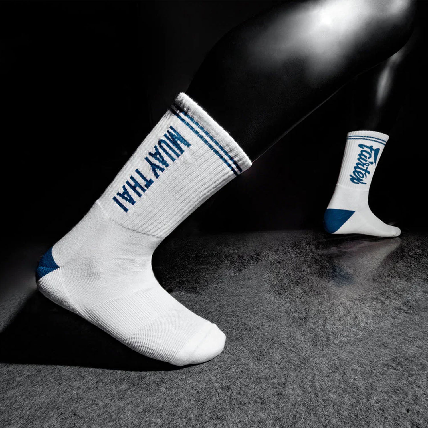 Unique design with "Fairtex" on one sock and "Muay Thai" on the other